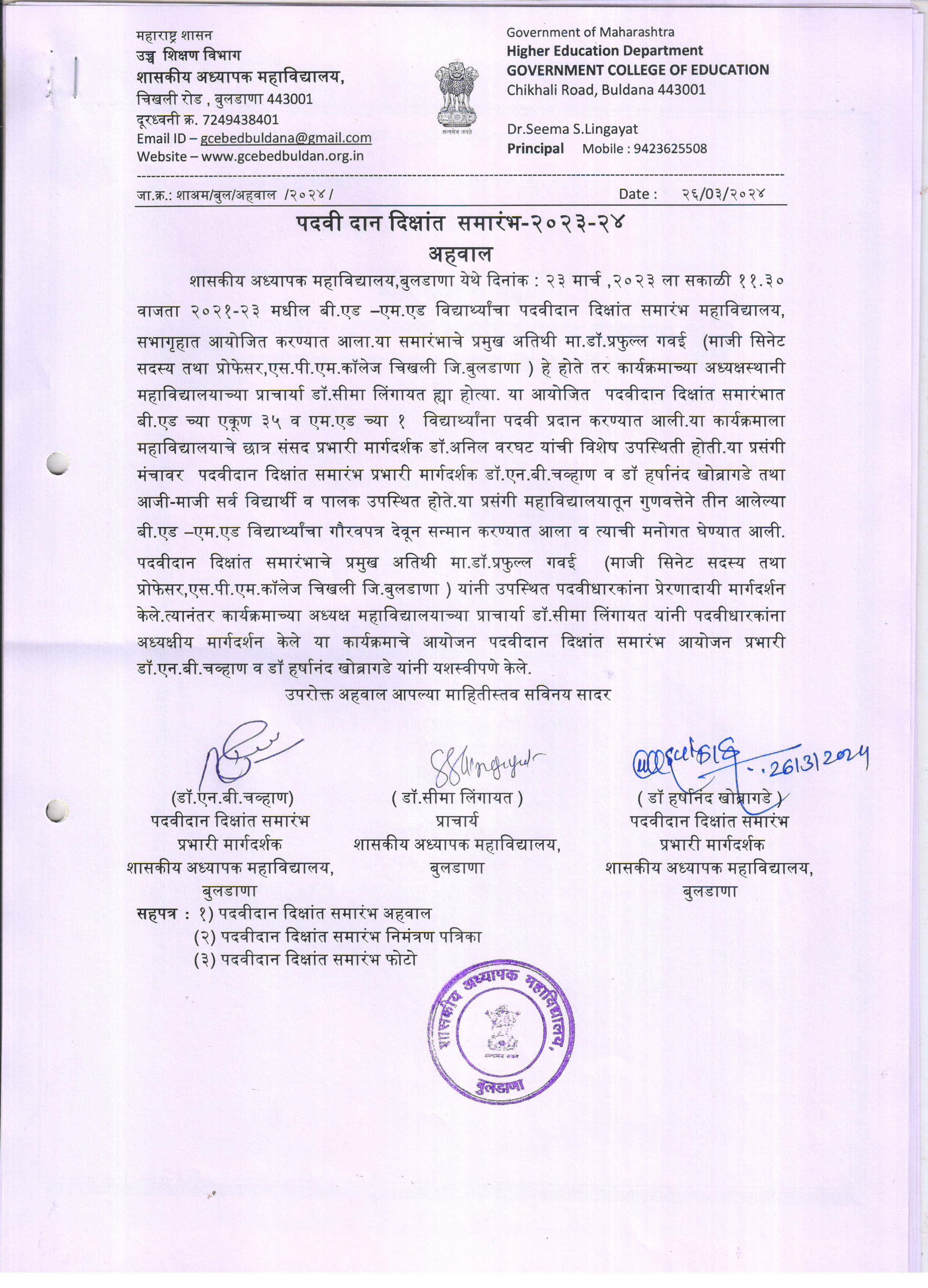 On behalf of Department Of Higher And Technical Education, Mantralaya, Mumbai and Director Of Higher Education, Maharashtra state, Pune I welcome you all and thank for visiting the web site of Government College of Education, Buldhana. The institution was started in 1968 by Govt. of Maharashtra as a ‘Normal School, specially to train the in-service teachers working in Vidarbha region the training institute namely, ‘Normal school’ was imparting the teachers. The B.Ed. course two years two years duration specially for in-services teachers. The in-services teachers training courses of three to seven days duration was being conducted for orienting or refreshing the new knowledge, concepts researches and methodologies to the secondary and upper primary teachers of BULDANA District on the strength of the financial assistance of state council for educational research and training (S.C.E.R.T.) Pune ...Read more